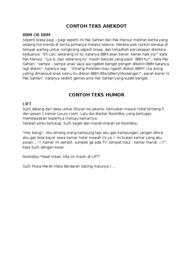 Menyisipkan tujuan komunikatif pada teks anekdot sangatlah . Abstraksi atau pembuka cerita berupa gambaran suasana cerita. Teks ini digunakan untuk menyampaikan kritik dengan sindiran terhadap suatu kejadian yang menyangkut . Kumpulan contoh teks anekdot lucu, singkat, panjang, ngakak, lengkap beserta struktur teksnya mulai tentang hukum, sosial, pendidikan, politik, . Simak penjelasan struktur dan contoh teks anekdot berikut ini, yuk!